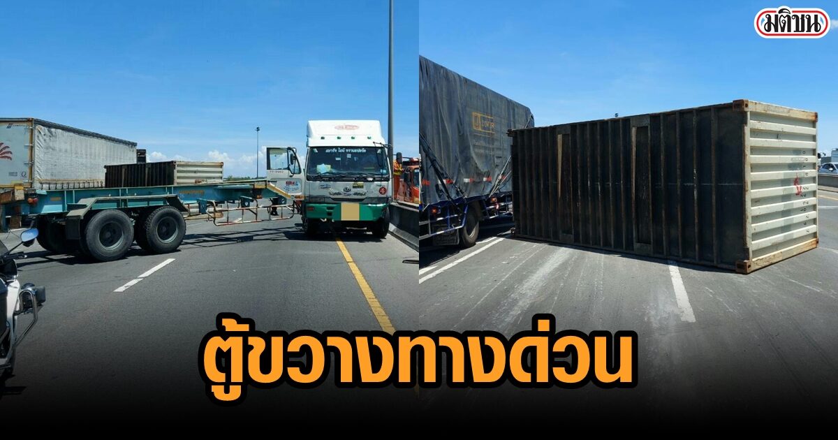 พ่วง 22ล้อ ทำตู้คอนเทนเนอร์ร่วง ขวางด่วนบางพลี-สุขสวัสดิ์ ทำรถติดยาวหลาย 10กิโล