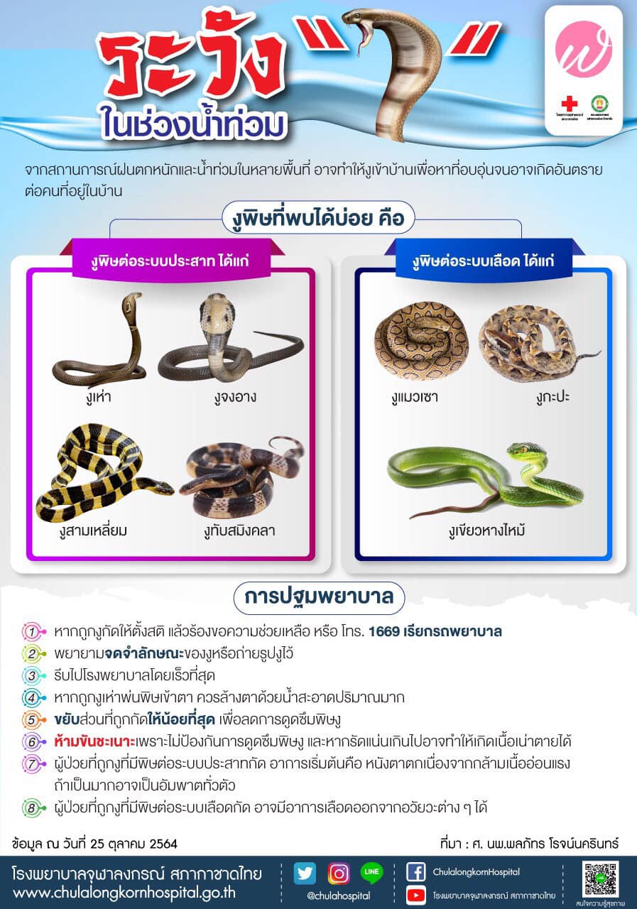 วันที่ 25 ตุลาคม 2564 ผู้สื่อข่าวรายงานว่า ศ.ดร.นพ.พลภัทร โรจน์นครินทร์ ศาสตราจารย์คณะแพทยศาสตร์ โรงพยาบาลจุฬาลงกรณ์ สภากาชาดไทย แจ้งเตือนประชาชนระวังอันตรายจาก “งู” ในช่วงน้ำท่วม ระบุว่า จากสถานการณ์ฝนตกหนักและน้ำท่วมในหลายพื้นที่ อาจทำให้งูเข้าบ้านเพื่อหาที่อบอุ่นจนอาจเกิดอันตรายต่อคนที่อยู่ในบ้าน งูพิษที่พบได้บ่อย คือ