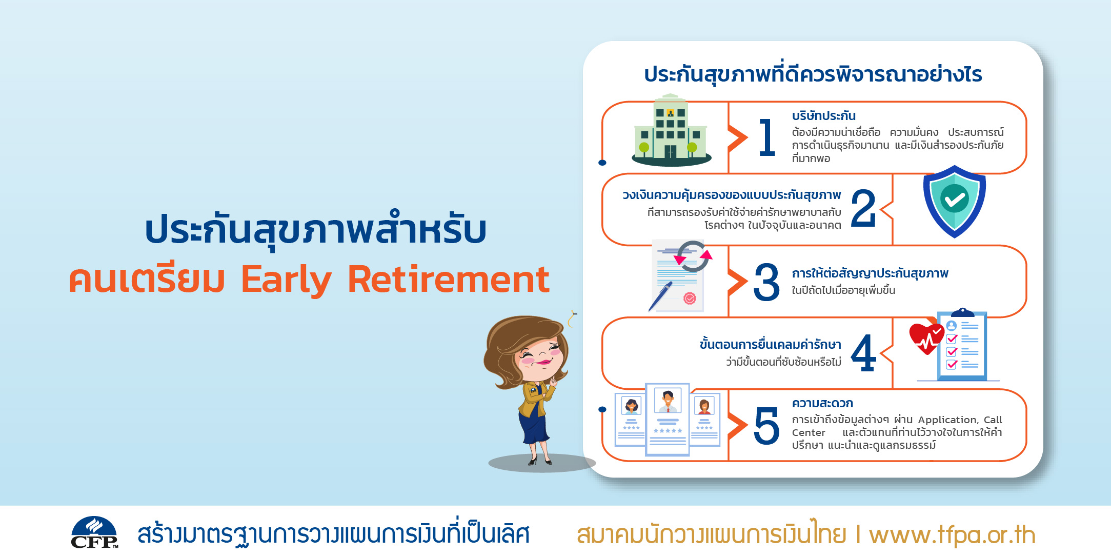 ในอนาคตอายุเกษียณของคนไทยมีแนวโน้มที่จะมากขึ้นเป็น 63 ปีหรือมากกว่า อายุขัยเฉลี่ยของคนไทยก็เพิ่มขึ้นเช่นเดียวกัน ถ้าอายุขัยเฉลี่ยคนไทยอยู่ที่ 85 ปี ยิ่งเกษียณเร็ว ช่วงปีใช้เงินหลังเกษียณก็ยิ่งมากขึ้น อาจจะมากถึง 25-40 ปี การรักษาสุขภาพที่ดีจะช่วยให้ท่านมีการดำเนินชีวิตที่ดีตลอดอายุขัย แต่ถ้ามีโรคภัย การเข้าถึงการรักษาพยาบาลที่ดี เทคโนโลยีทางการแพทย์ที่ทันสมัยมากขึ้น ก็สามารถช่วยให้ท่านได้รับการรักษาทันท่วงที หายไว สามารถกลับมาใช้ชีวิตได้ปกติเร็วขึ้นด้วย ดังนั้นเพื่อการวางแผน Early Retirement ที่สมบูรณ์ ต้องมีประกันสุขภาพรองรับค่ารักษาพยาบาลให้พอกันด้วย