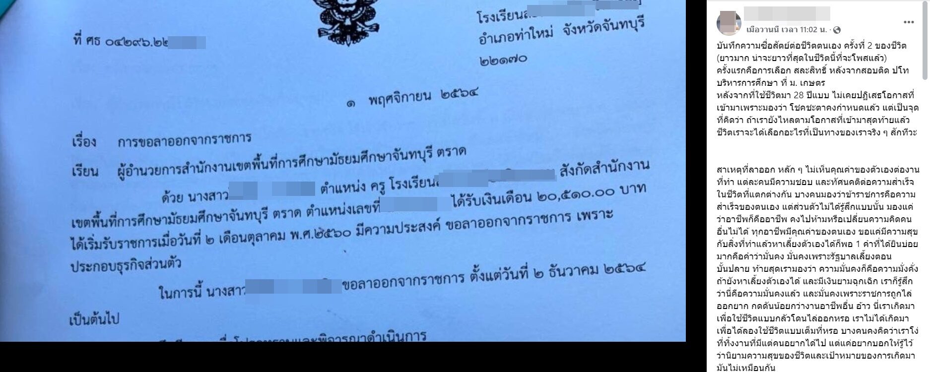 เมื่อวันที่ 21 ธันวาคม 2564 โซเชียลแห่แชร์โพสต์ของครูสาวโรงเรียนแห่งหนึ่งใน จ.จันทบุรี สังกัดกระทรวงศึกษาธิการ (ศธ.) ที่ได้ทำหนังสือลาออกจากข้าราชการครูที่ทำมาได้ 4 ปี โดยมีรายละเอียด ดังนี้
