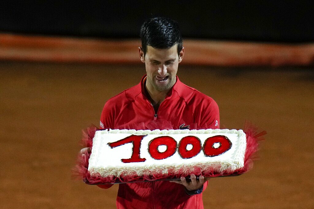 Serbia’s Novak Djokovic holds a cake adorned with the number of his 1,000th tour-level wins earned after winning the semifinal match against Norway’s Casper Ruud at the Italian Open tennis tournament, in Rome, Saturday, May 14, 2022. (AP Photo/Alessandra Tarantino)