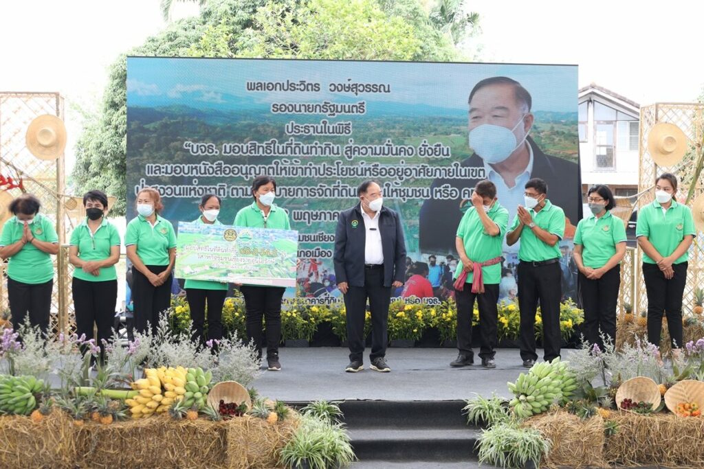 พล.อ.ประวิตร กล่าวว่า รัฐบาล เล็งเห็นความสำคัญ ในการช่วยเหลือพี่ น้อง เกษตรกร และผู้ยากจน ในเรื่องที่ดินทำกิน มาโดยตลอด และดำเนินการผ่านโครงการของหน่วยงานต่างๆ หลายหน่วยงาน สถาบันบริหารจัดการธนาคารที่ดิน (องค์การมหาชน) หรือ บจธ. เป็นหน่วยงานที่ได้รับมอบหมาย ให้ดำเนินภารกิจ กระจายการถือครองที่ดินอย่างเป็นธรรมและยั่งยืน เพื่อช่วยเหลือเกษตรกรและผู้ยากจน ในการแก้ไขปัญหาด้านที่ดินทำกินและที่อยู่อาศัย การป้องกันการสูญเสียสิทธิในที่ดิน จากการจำนอง ขายฝาก ตลอดจนส่งเสริมการใช้ประโยชน์ในที่ดิน เพื่อประโยชน์ในการพัฒนาประเทศอย่างยั่งยืน บจธ. ได้ยกร่างพระราชบัญญัติ สถาบันบริหารจัดการที่ดินและกระจายการถือครองที่ดินอย่างเป็นธรรมและยั่งยืน พ.ศ. …. ขึ้น เพื่อเป็นการสะท้อนให้เห็นถึงภารกิจของ บจธ. โดยมาจากการปฏิบัติงานจริงของ บจธ. ซึ่งได้ถูกขัดเกลา ด้วยการมีส่วนร่วมจากหน่วยงาน ภาครัฐ ภาคประชาชน ภาคประชาสังคม โดยมีการปรับรูปแบบ และอำนาจหน้าที่ ให้มีความเหมาะสม และสะท้อนถึงการแก้ไขปัญหา โดยยึดมิติทางสังคมเป็นหลัก ไม่ใช่มิติด้านการเงิน การธนาคาร อย่างที่ผ่านมา สำหรับการจัดที่ดินทำกินให้ชุมชน เข้าทำประโยชน์ หรืออยู่อาศัย ภายในเขตป่าสงวนแห่งชาติ ได้มีการออกหนังสืออนุญาตแล้ว จำนวนทั้งสิ้น 4 พื้นที่ โดยในวันนี้ จะมอบหนังสืออนุญาตฯ ให้ 2 พื้นที่ ประกอบด้วย 1. ป่าแม่อิงฝั่งขวา และป่าแม่งาว และ 2. ป่าน้ำหงาวฝั่งซ้าย โดยจะขอมอบให้ผู้ว่าราชการจังหวัด เป็นผู้รับมอบ หนังสืออนุญาตแทน พี่ น้อง ประชาชน