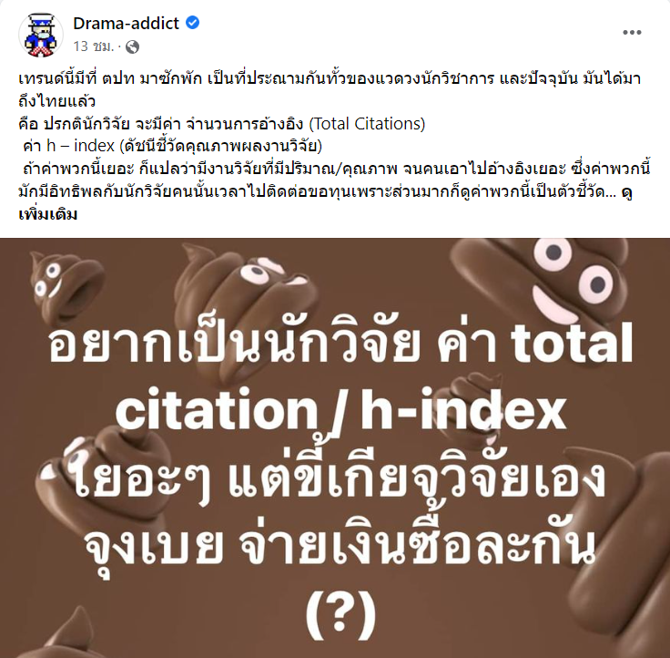 ทางเพจเขียนข้อความว่าเทรนด์นี้มีที่ ตปท มาซักพัก เป็นที่ประณามกันทั้วของแวดวงนักวิชาการ และปัจจุบัน มันได้มาถึงไทยแล้ว คือ ปรกตินักวิจัย จะมีค่า จำนวนการอ้างอิง (Total Citations) ค่า h – index (ดัชนีชี้วัดคุณภาพผลงานวิจัย) ถ้าค่าพวกนี้เยอะ ก็แปลว่ามีงานวิจัยที่มีปริมาณ/คุณภาพ จนคนเอาไปอ้างอิงเยอะ ซึ่งค่าพวกนี้มักมีอิทธิพลกับนักวิจัยคนนั้นเวลาไปติดต่อขอทุนเพราะส่วนมากก็ดูค่าพวกนี้เป็นตัวชี้วัด